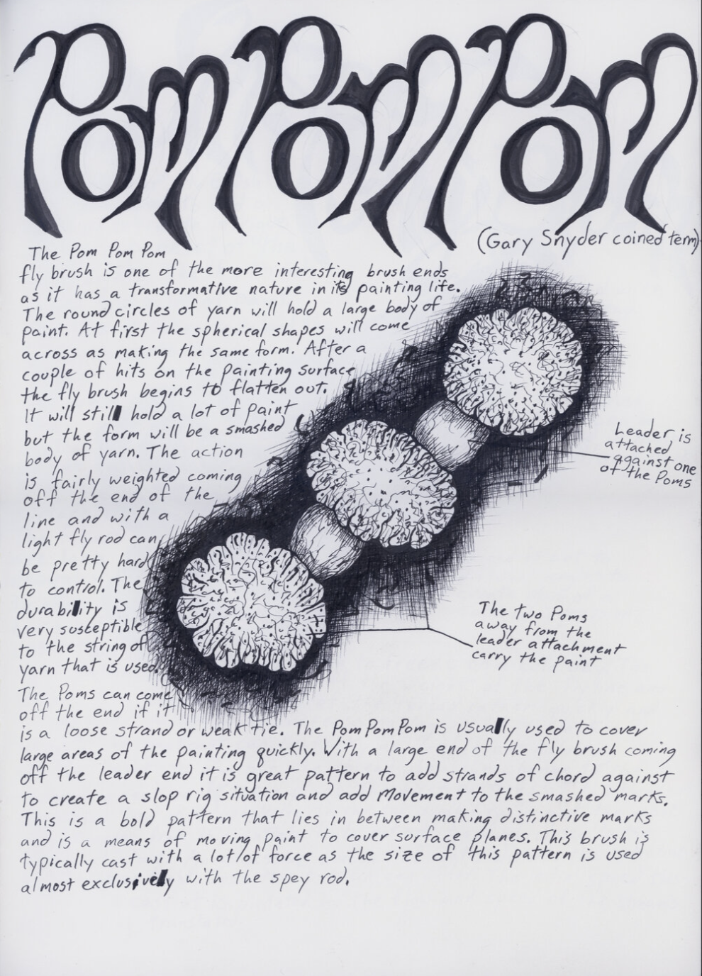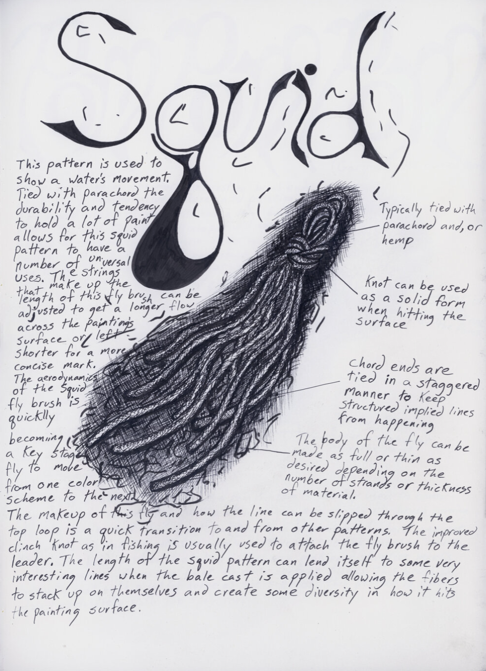 In the best angler’s tradition, Miller names each of his fly brushes. Some are obvious – Squid, Caterpillar, Cocoon, Worm – others fanciful: the Anarchy Beetle, Slop Plug, Toobal, Voop-Voop, and Major Tom’s, to mention only a few. Miller draws each one in a large sketchbook, adding a lengthy notation of what each is for and how it works.